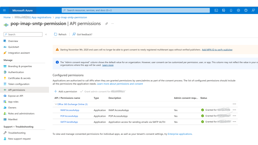 これで、SMTP、POP、または IMAP アプリケーションのアクセス許可が Entra アプリケーションのアクセス許可に追加されます。