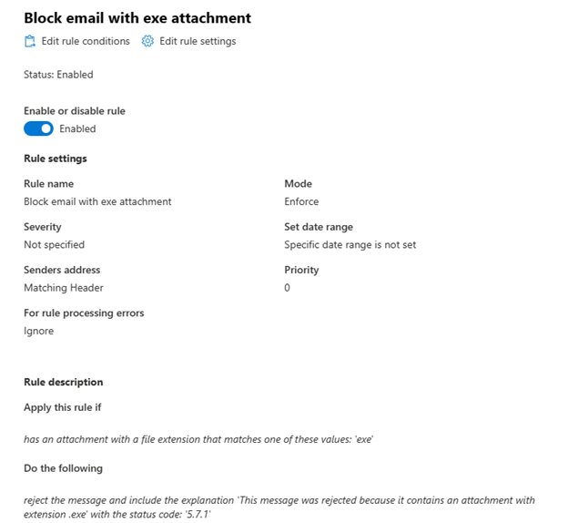 New-TransportRule -Name "Block Executable Attachments" -AttachmentHasExecutableContent $true -DeleteMessage $true