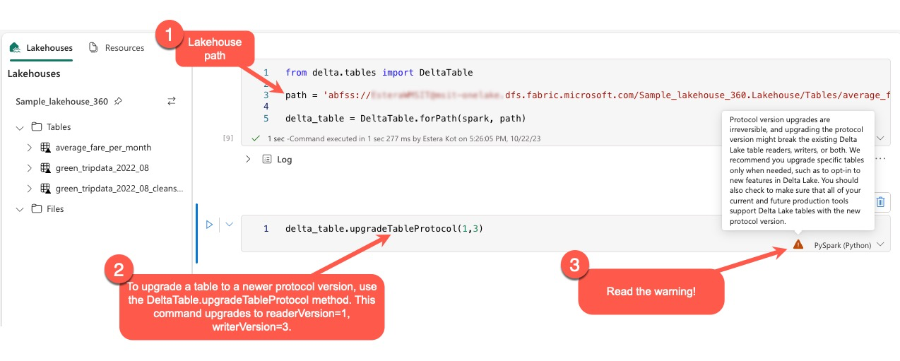ユーザーは PySpark 環境、Spark SQL、Scala 内でコマンド delta.upgradeTableProtocol(minReaderVersion, minWriterVersion) を実行できます。 このコマンドにより、Delta テーブルの更新を開始することができます。