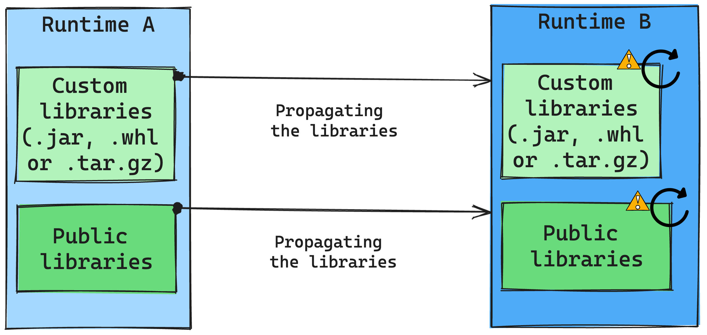一般に、Microsoft のアプローチは、パブリック ランタイムとカスタム ランタイムの両方を含むすべてのライブラリをランタイム A からランタイム B に移行することです。 Python と R のバージョンが変更されていない場合、ライブラリは正しく機能するはずです。 ただし、Jars の場合、依存関係の変更や、Scala、Java、Spark、オペレーティング システムの変更などのその他の要因により、機能しなくなる可能性が非常に高くなります。