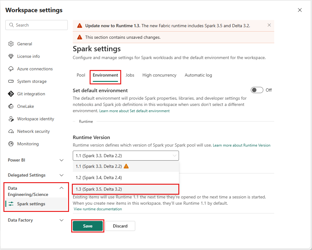 ワークスペース レベルでランタイム バージョンを変更するには、Data Engineering/Science