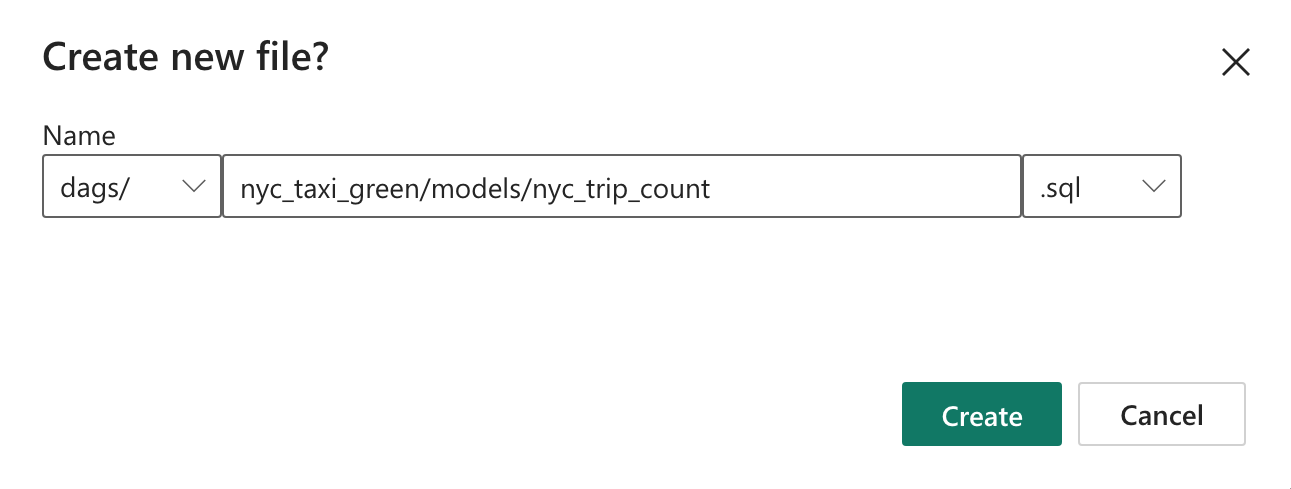 profiles.ymlファイルにコピーします。 この構成ファイルには、dbt が使用するデータベース接続の詳細とプロファイルが含まれています。 プレースホルダーの値を更新し、ファイルを保存します。config: partial_parse: true nyc_taxi_green: target: fabric-dev outputs: fabric-dev: type: fabric driver: "ODBC Driver 18 for SQL Server" server: <sql connection string of your data warehouse> port: 1433 database: "<name of the database>" schema: dbo threads: 4 authentication: ServicePrincipal tenant_id: <Tenant ID of your service principal> client_id: <Client ID of your service principal> client_secret: <Client Secret of your service principal>dbt_project.ymlファイルを作成し、次の内容をコピーします。 このファイルは、プロジェクト レベルの構成を指定します。name: "nyc_taxi_green" config-version: 2 version: "0.1" profile: "nyc_taxi_green" model-paths: ["models"] seed-paths: ["seeds"] test-paths: ["tests"] analysis-paths: ["analysis"] macro-paths: ["macros"] target-path: "target" clean-targets: - "target" - "dbt_modules" - "logs" require-dbt-version: [">=1.0.0", "<2.0.0"] models: nyc_taxi_green: materialized: tablemodelsフォルダーに、nyc_taxi_greenフォルダーを作成します。 このチュートリアルでは、ベンダーごとの 1 日あたりの乗車数を示すテーブルを作成するnyc_trip_count.sqlという名前のファイルにサンプル モデルを作成します。 次の内容をファイルにコピーします。with new_york_taxis as ( select * from nyctlc ), final as ( SELECT vendorID, CAST(lpepPickupDatetime AS DATE) AS trip_date, COUNT(*) AS trip_count FROM [contoso-data-warehouse].[dbo].[nyctlc] GROUP BY vendorID, CAST(lpepPickupDatetime AS DATE) ORDER BY vendorID, trip_date; ) select * from final