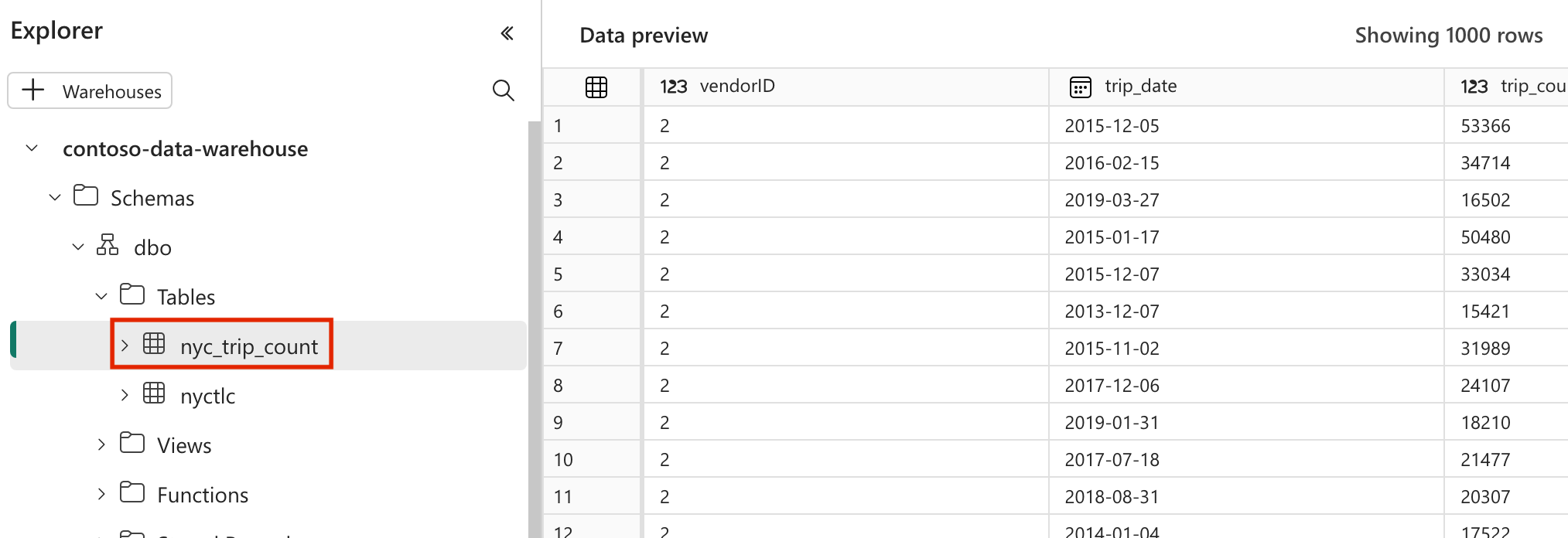 正常に実行された後、Fabric データ ウェアハウスの "nyc_trip_count.sql" という名前の新しいテーブルを確認して、データを検証します。