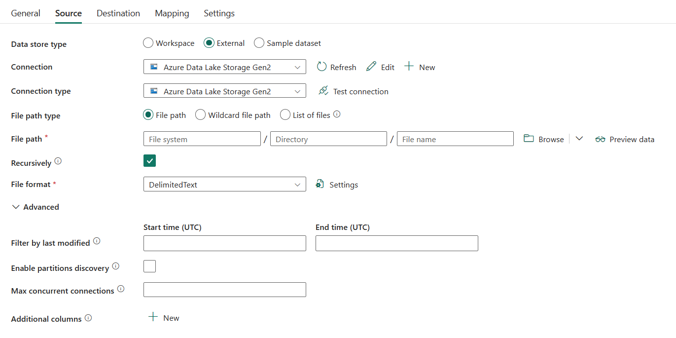 - 接続: 接続の一覧から Azure Data Lake Storage Gen2 接続を選択します。 接続が存在しない場合は、[新規] を選択して新しい Azure Data Lake Storage Gen2 接続を作成します。