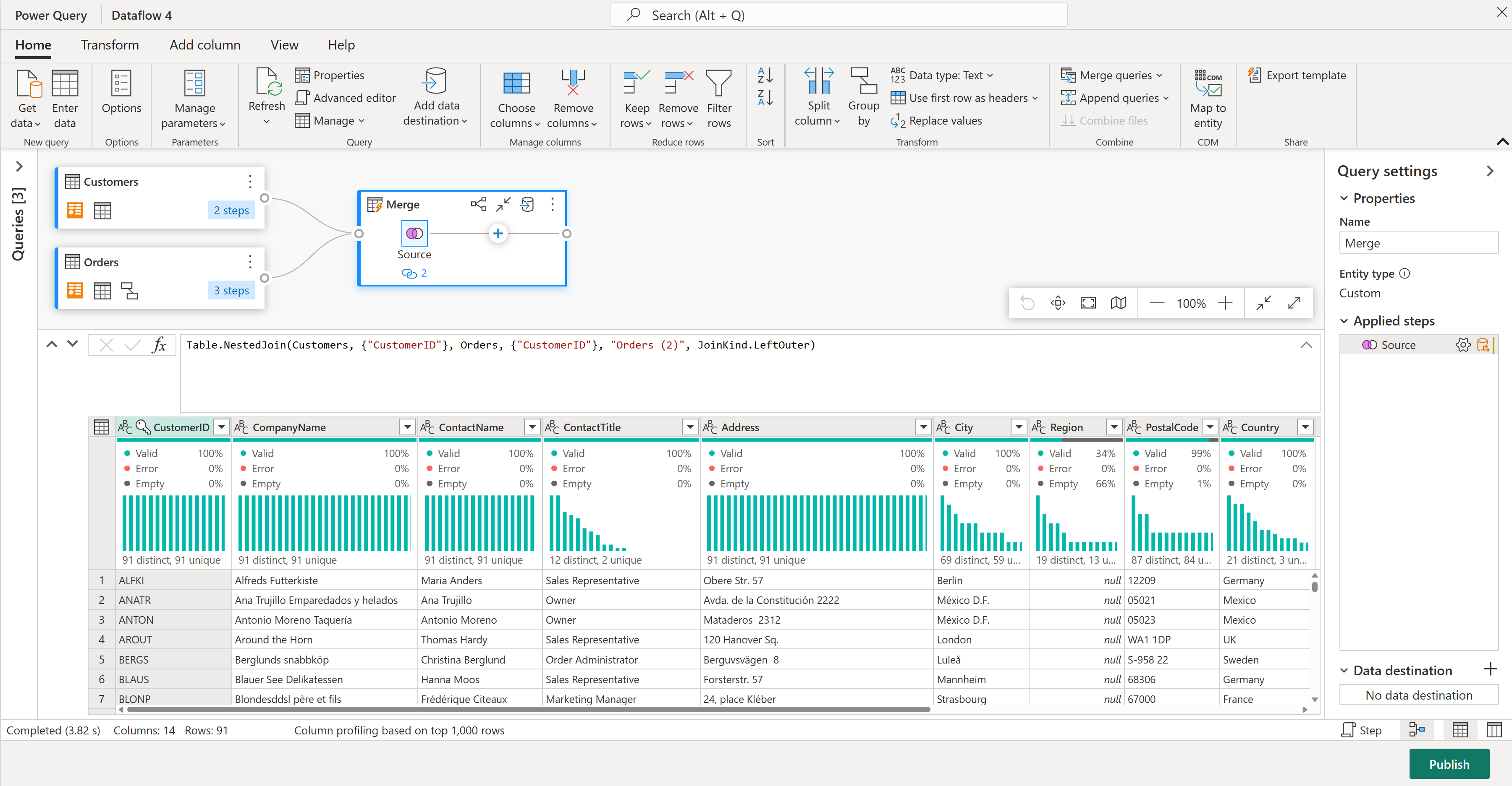 両方のテーブルで一致する列として CustomerID を選択して、マージ操作を構成します。 そして Ok を選択します。