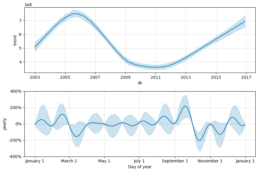これらのグラフでは、薄い青色のシェーディングが不確定性を反映しています。 上のグラフは、強い、長い期間の揺れる傾向を示しています。 数年周期で、販売量は増加と減少を繰り返しています。 下のグラフは、売上が 2 月と 9 月にピークに達し、その月の年の最大値に達する傾向があることを示しています。 これらの月の直後である 3 月と 10 月は、年の最小値に分類されます。