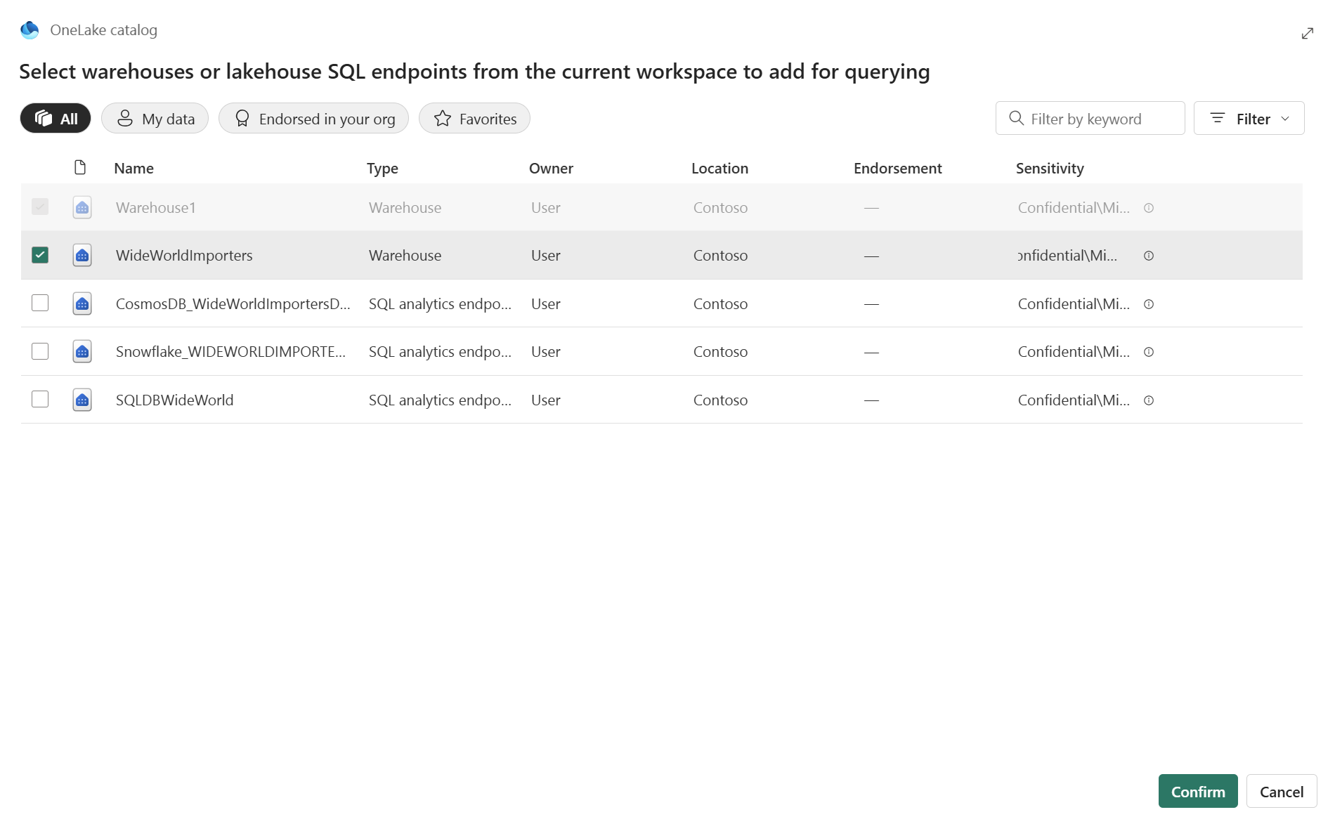 [+ Warehouses] アクションを使用して、現在アクティブなワークスペースからオブジェクト エクスプローラーに SQL 分析エンドポイントまたはウェアハウス を追加します。 ダイアログから [SQL 分析エンドポイント] または [ウェアハウス] を選択すると、SQL クエリの作成時またはビジュアル クエリの作成時に参照するためのオブジェクト エクスプローラーに追加されます。