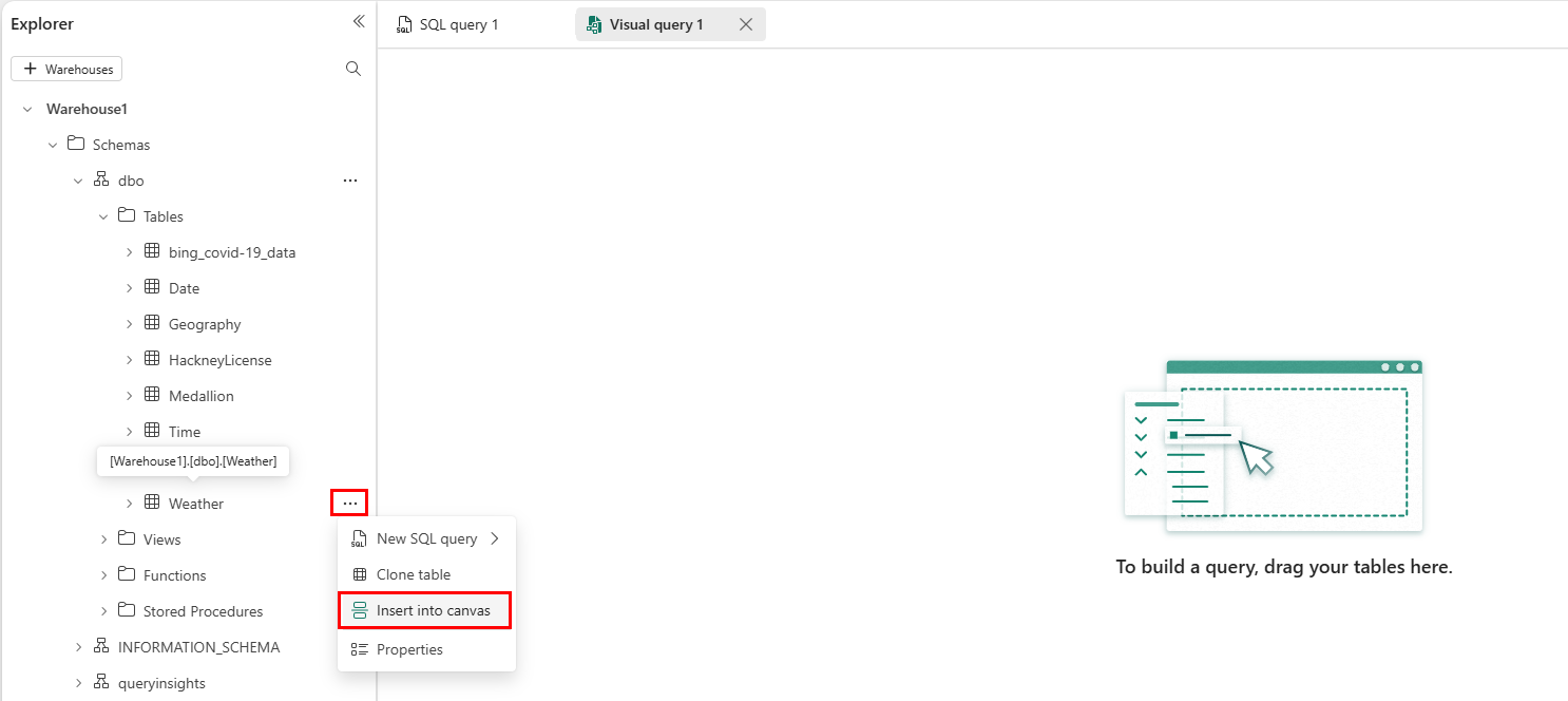 エクスプローラーの でテーブルを右クリックするか、アクション メニューを選択して、[キャンバスに挿入] 選択します。 または、Explorerからテーブルを選択、保持、ドラッグして、ビジュアル クエリにドラッグ アンド ドロップすることもできます。