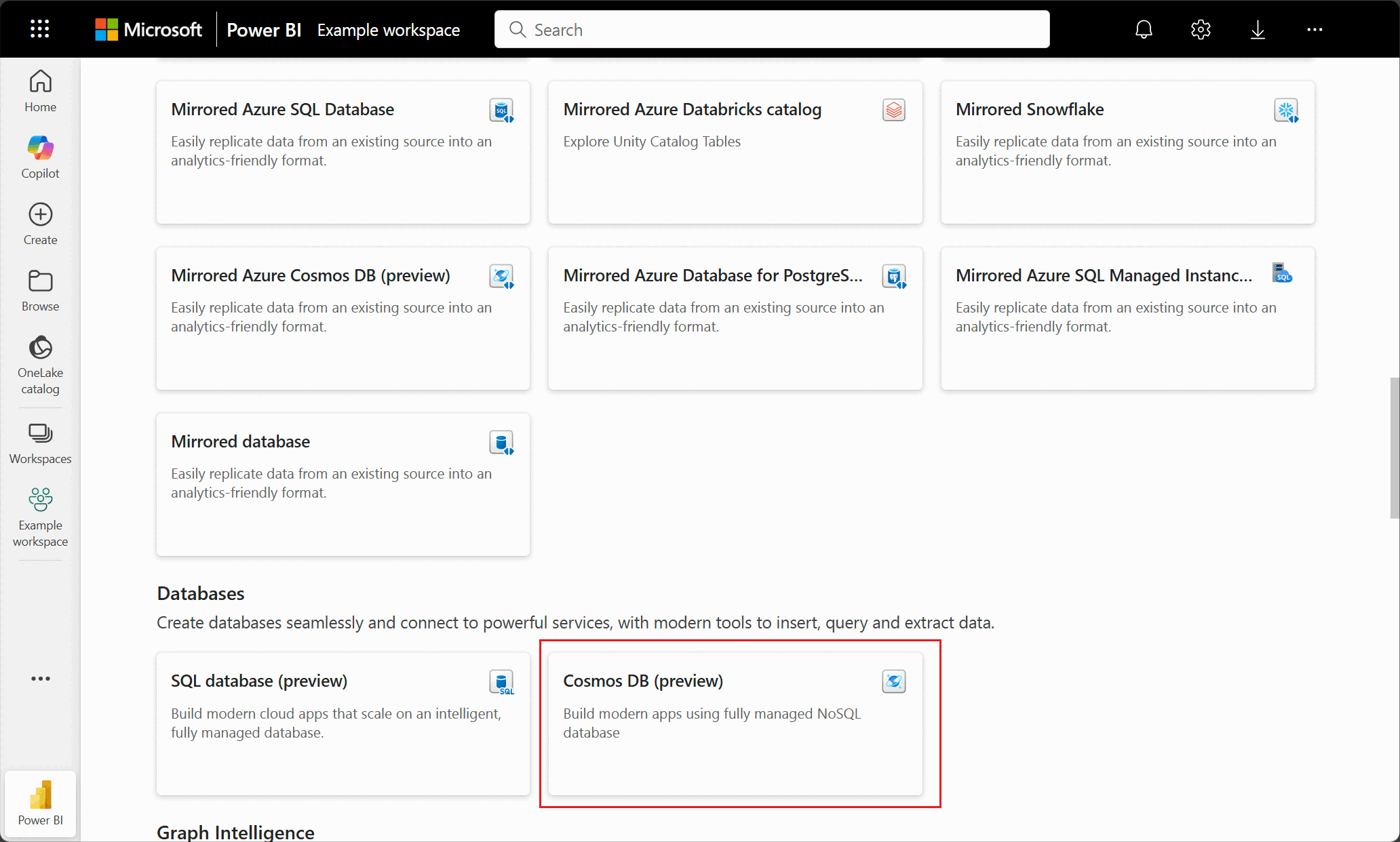 まず、Fabric ポータルに移動し、ワークスペース内に新しい Cosmos DB データベースを作成します。