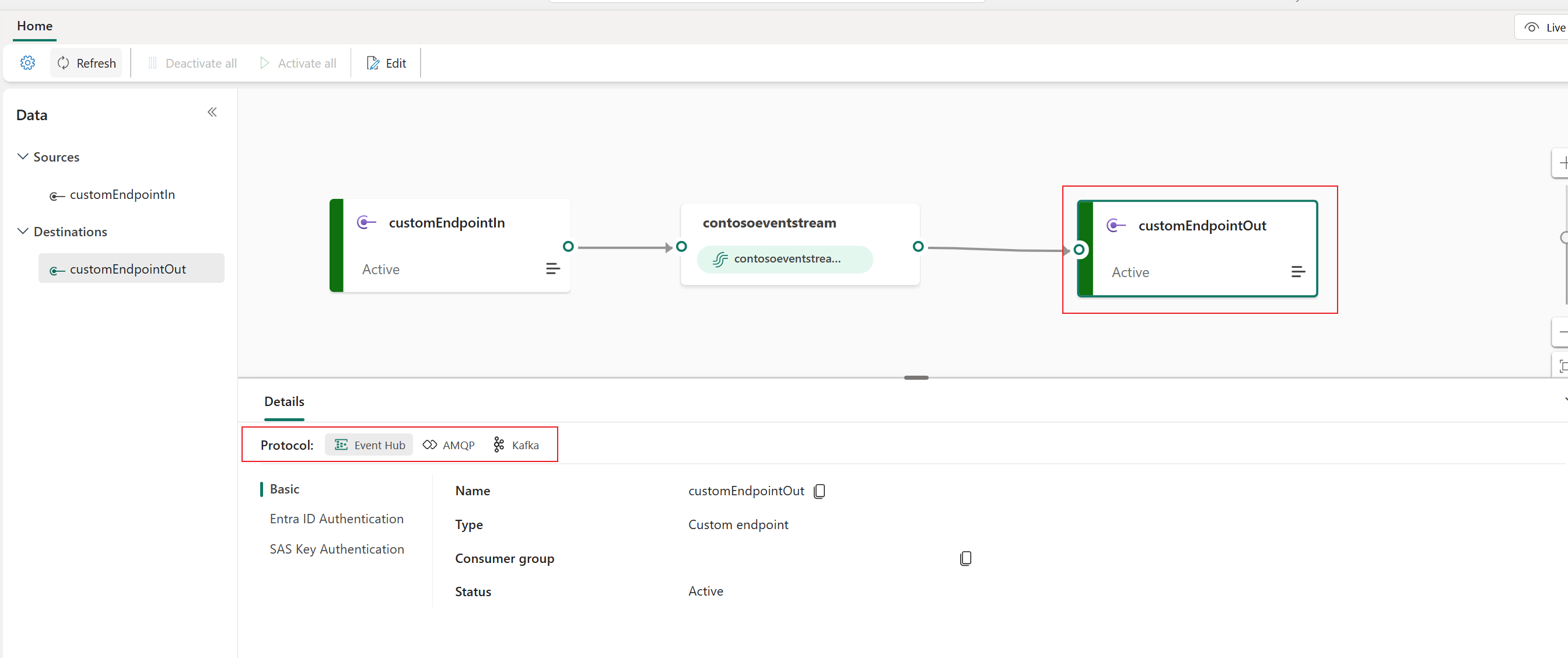 Kafka プロトコルでのカスタム エンドポイントの使用に関する明確なガイドについては、 このチュートリアルを参照してください。 カスタム エンドポイントと Kafka プロトコルを使用してイベントをストリーミングおよび使用するための詳細な手順について説明します。
