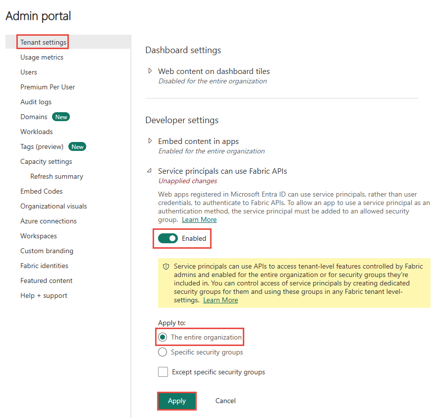 次のテナント設定をアクティブ化して、ワークスペース、接続、またはデプロイ パイプラインを作成するための Fabric API へのアクセス権をサービス プリンシパルに付与します。