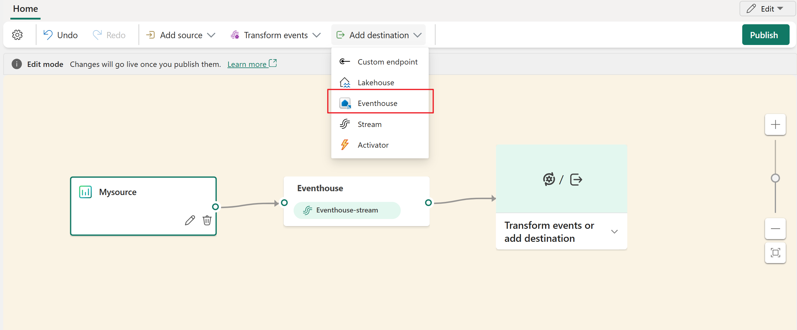 Eventstream の [編集モード] で、リボンの [宛先の追加] を選択するか、キャンバスで [イベントの変換] または [宛先の追加] カードを選択してから、[イベントハウス] を選択します。