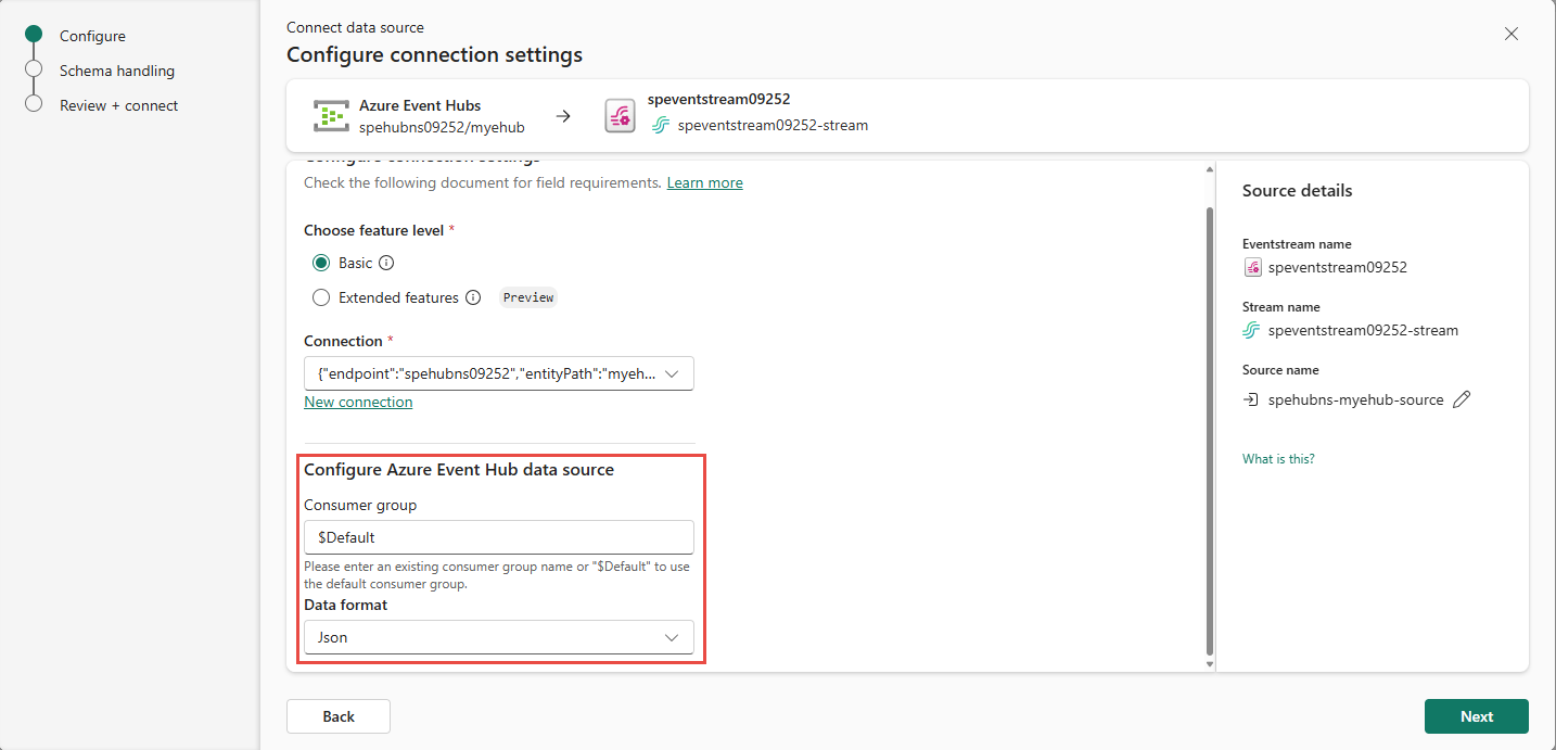 Azure イベント ハブへの既存の接続がある場合は、次の図に示すように既存の接続を選択し、次の手順でデータ形式を構成する手順を進めます。
