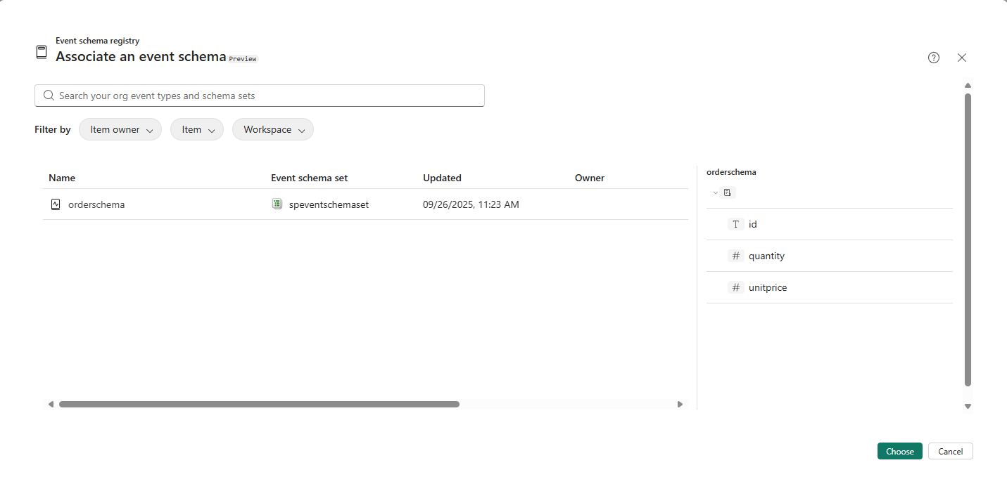 [ イベント スキーマ レジストリから選択 ] オプションを選択すると、[ イベント スキーマの関連付け ] ページが表示されます。 スキーマ一致モードに応じて、レジストリから 1 つ以上のスキーマを選択し、ページの下部にある [選択 ] を選択します。