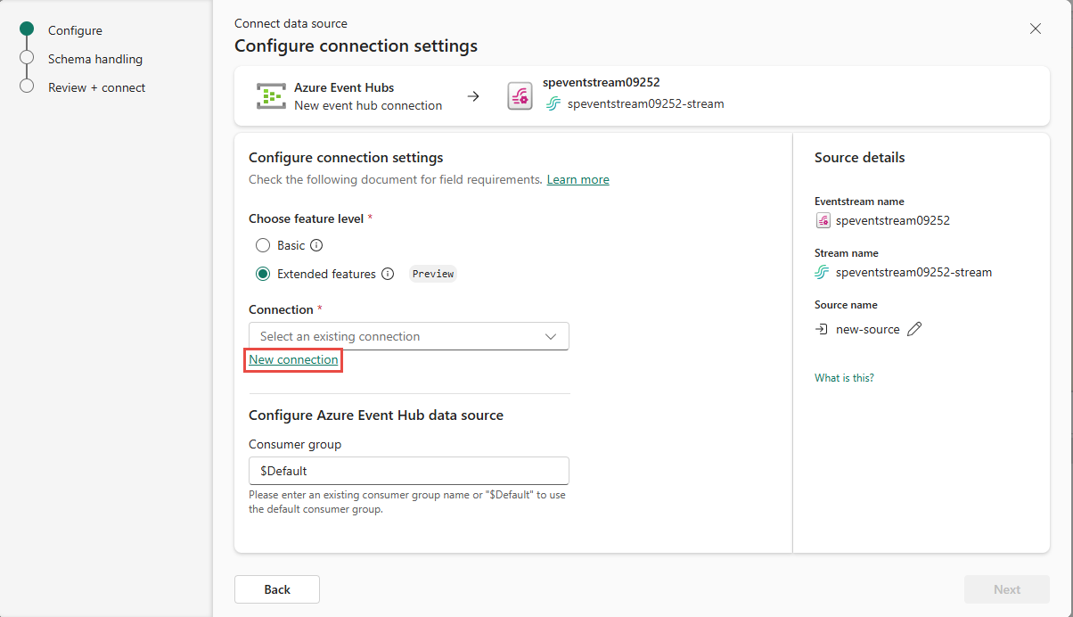 [ 接続 ] ページの [機能レベル] で、[ 拡張機能 (プレビュー)] を選択します。