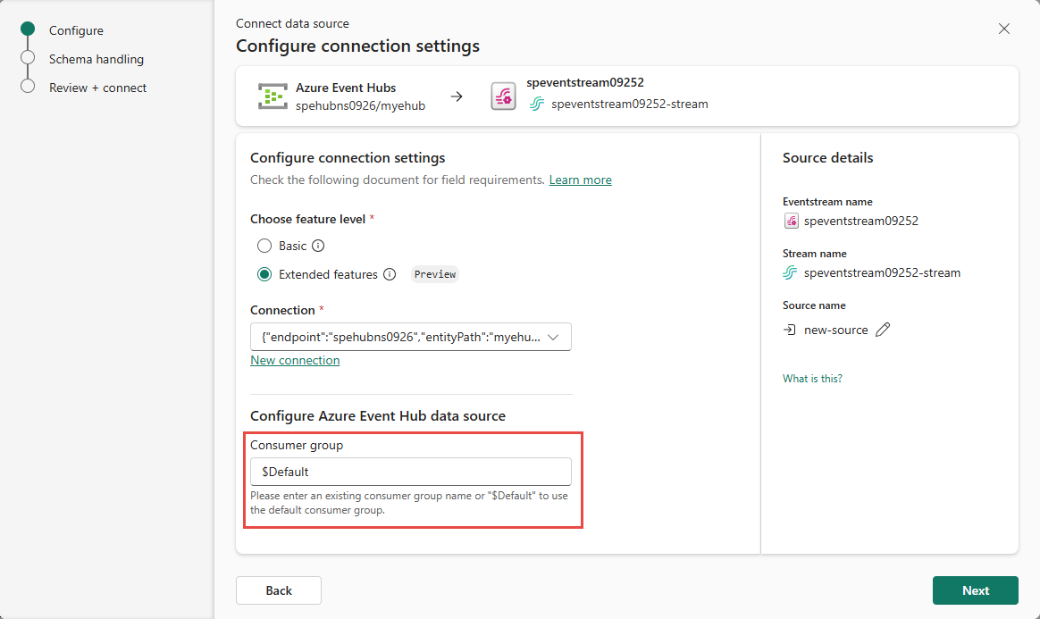 次に、ウィザードの [接続] ページの [コンシューマー グループ]に、コンシューマー グループの名前を入力します。 既定では、イベント ハブの既定のコンシューマー グループである
