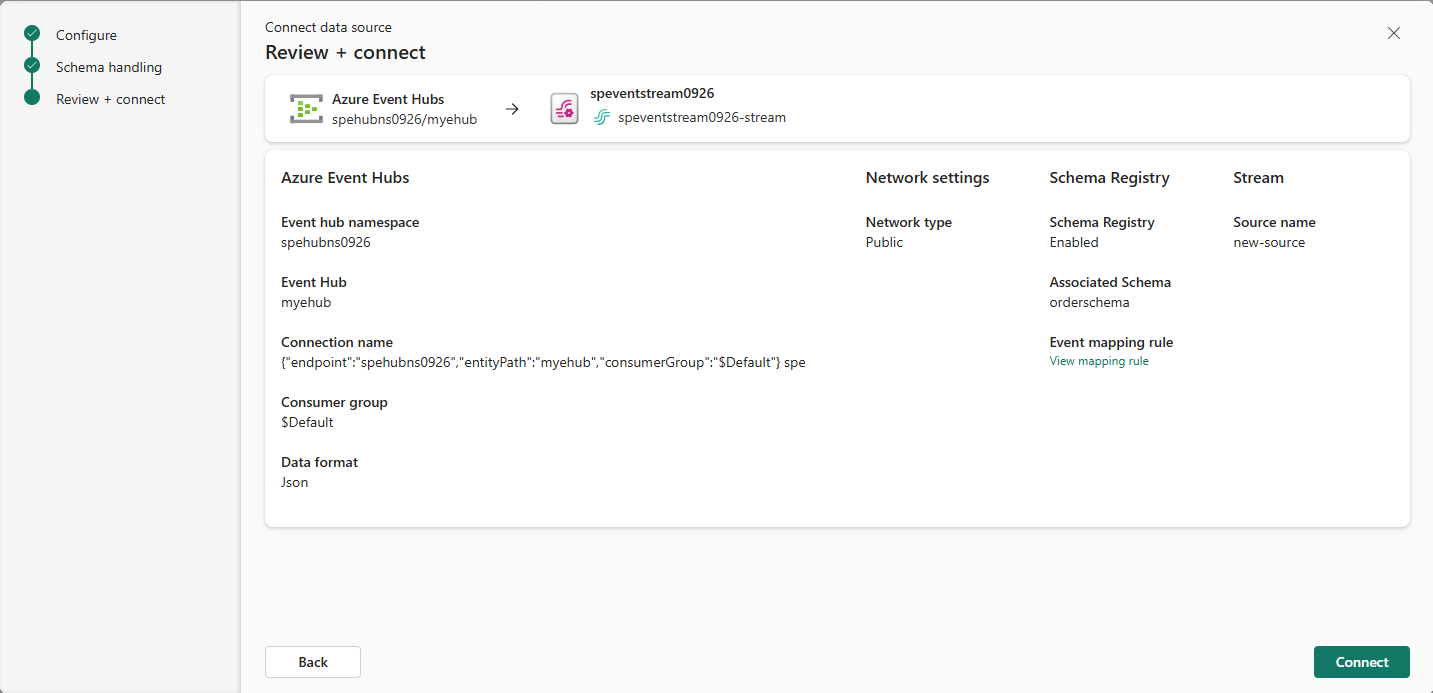 [ スキーマ処理 ] ページで、選択した Eventhub から受信したイベントを処理するルールを指定して、Eventstream がそれらを正しく適用できるようにする必要があります。 マッピング ルールは、イベントのモデル化方法によって異なります。