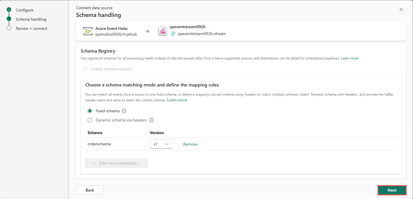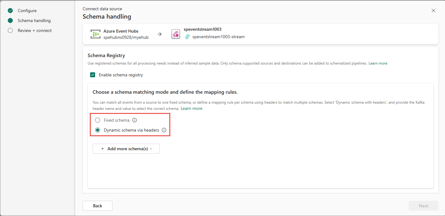 [固定スキーマ] オプションを選択した場合は、スキーマに一致する規則をこれ以上指定する必要はありません。 次の手順に進むことができます。 [ ヘッダーによる動的スキーマ ] オプションを選択した場合は、 Kafka ヘッダー プロパティ と、スキーマにマップされる 予期される値 を指定します。 スキーマをさらに追加し、それらのスキーマにマップするさまざまなヘッダー プロパティや異なる値を指定します。