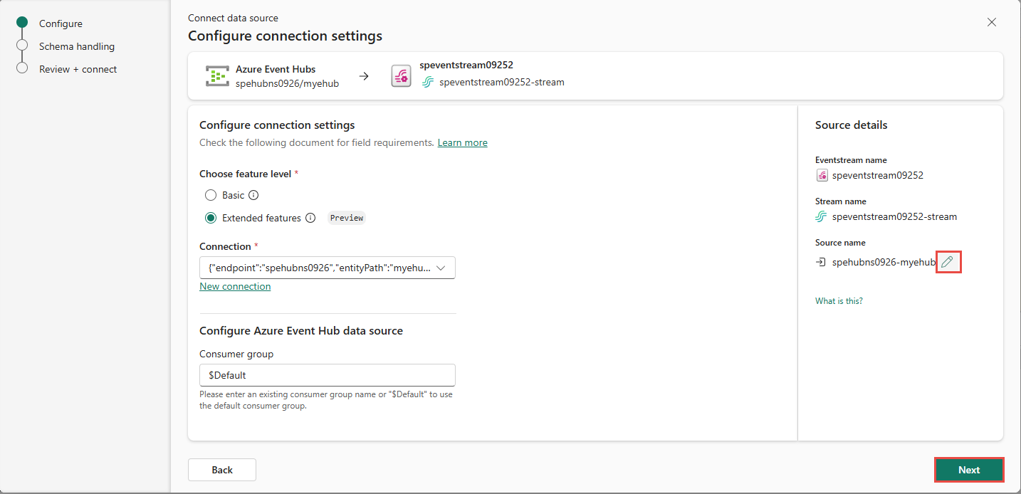 $Defaultが選択されています。(省略可能)ソースの名前をカスタマイズするには、右側の [ストリームの詳細] ウィンドウでソース名の横にある鉛筆アイコンを選択し、ソースの名前を入力します。 次に、ページの下部にある [ 次へ ] を選択します。