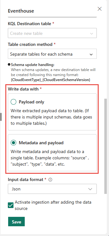 ペイロードのみ: 抽出されたペイロード データをテーブルに書き込みます。 複数の入力スキーマがある場合、データは複数のテーブルに送信されます。
