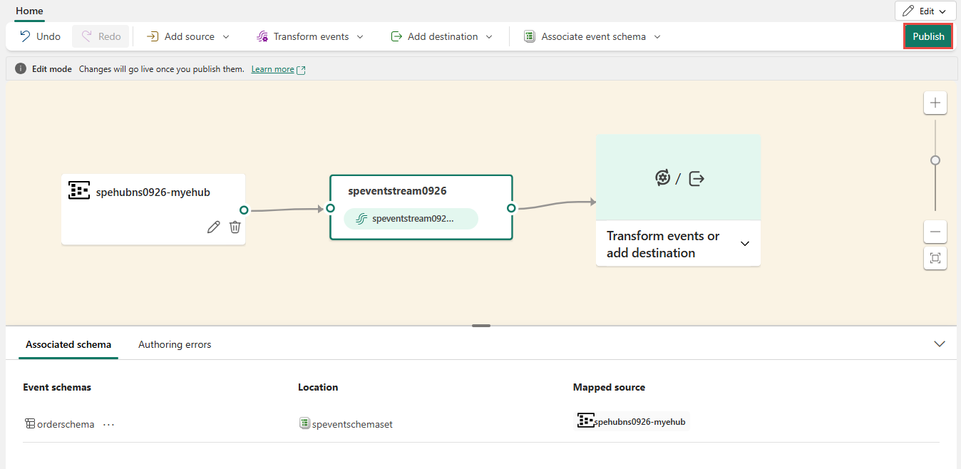 編集モードで、Event Hubs ソースがキャンバス上の eventstream に追加されていることがわかります。 下部ペインの [最新の情報に更新] を選択すると、イベント ハブ内のデータのプレビューが表示されます。 この新しく追加された Azure イベント ハブを実装するには、リボンの [発行] を選択します。