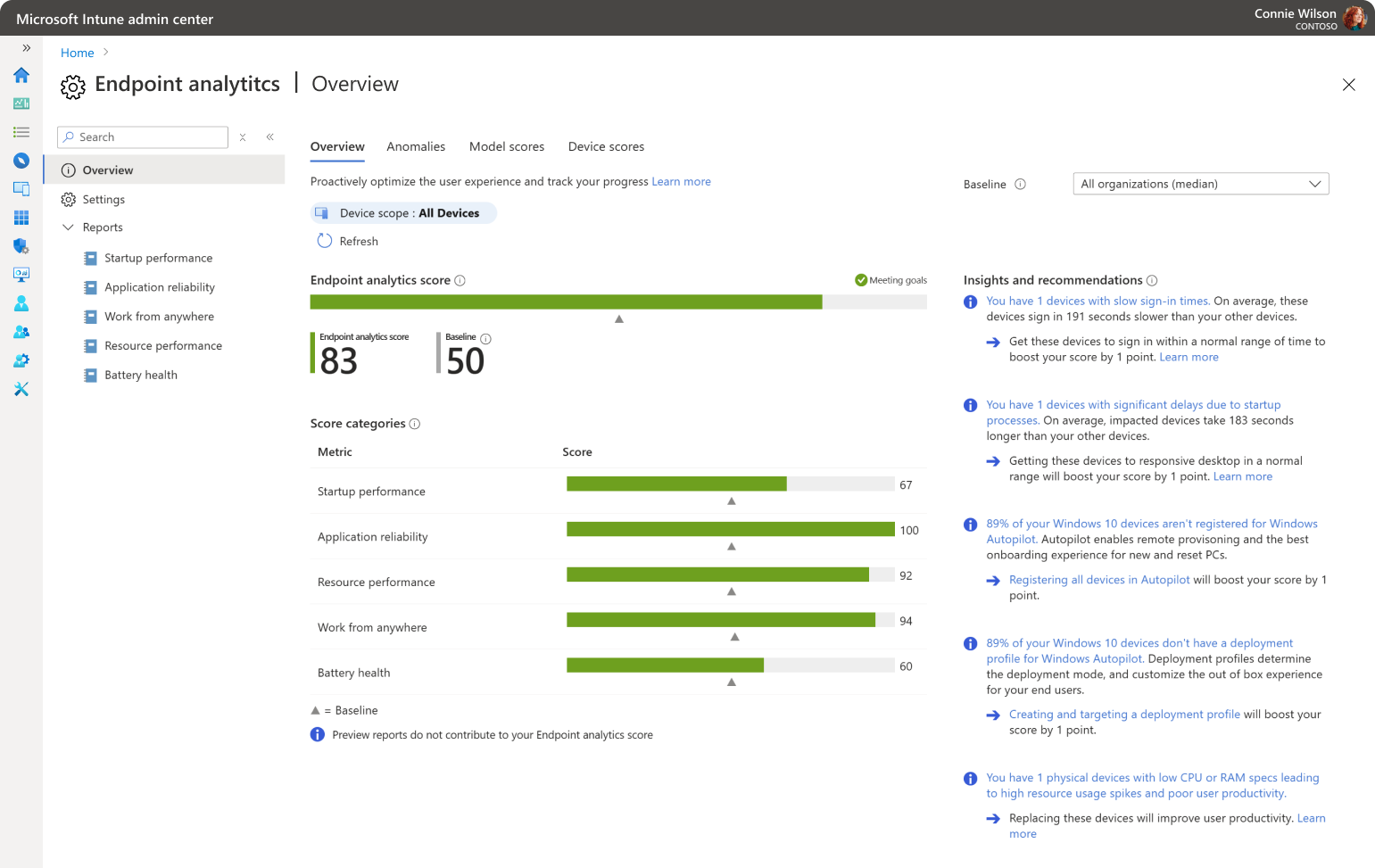 エンドポイント分析は、IT プロフェッショナルがマネージド デバイス全体のユーザー エクスペリエンスを評価して向上させるのに役立ちます。 デバイスのパフォーマンス、起動時間、アプリの信頼性、バッテリーの正常性に関するデータ駆動型の分析情報を提供します。IT チームは、生産性に影響を与える問題を事前に特定して修復できます。