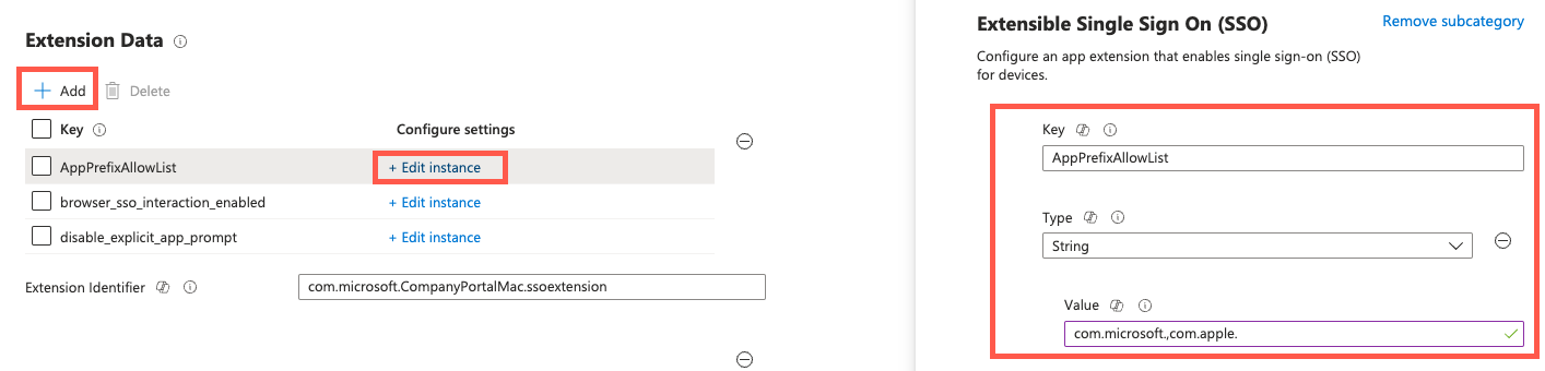 既存のプラットフォーム SSO 設定カタログ ポリシーで、 拡張機能データを追加します。