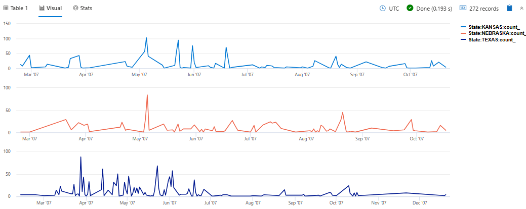 次の例では、テキサス州、ネブラスカ州、およびカンサス州の毎日の雹イベントをレンダリングします。 視覚化では、ysplit プロパティを使用して、比較のために各状態のイベントを個別のパネルにレンダリングします。