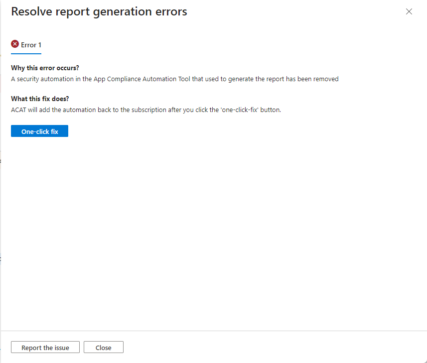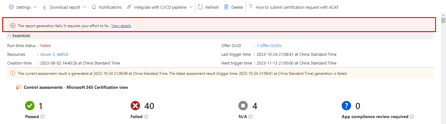 ACAT は、基本設定トリガー時間に構成されているように、レポートのコンプライアンス評価を日常的に更新します。 コンプライアンス評価の更新中にエラーが発生した場合、コンプライアンス レポートの実行時の状態は "Failed" になります。 最後に成功したコンプライアンス評価を確認できますが、失敗を解決し、新しいコンプライアンス評価を後で更新するには、提供されている自己回復ガイダンスに従う必要があります。