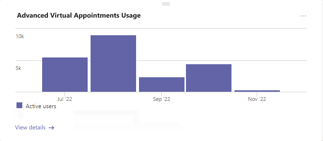 Teams 管理センターのダッシュボードで、[高度な仮想予定使用状況] カードに移動します。 ここでは、すべての機能にわたるアクティブユーザーの総数を月別に一目で確認できます。