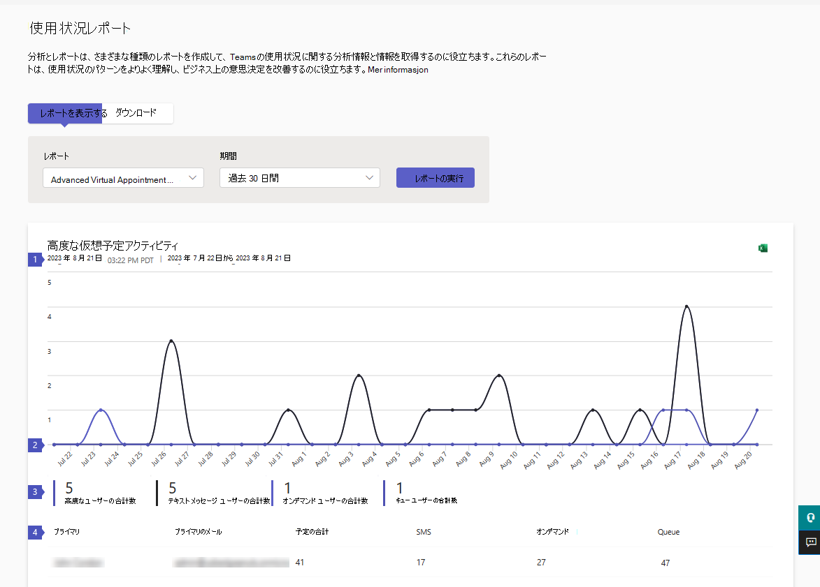 Microsoft Teams管理センターの Advanced 仮想予定 アクティビティ レポートには、Teams Premiumで使用できる高度な仮想予定機能のユーザー アクティビティ情報が表示されます。
