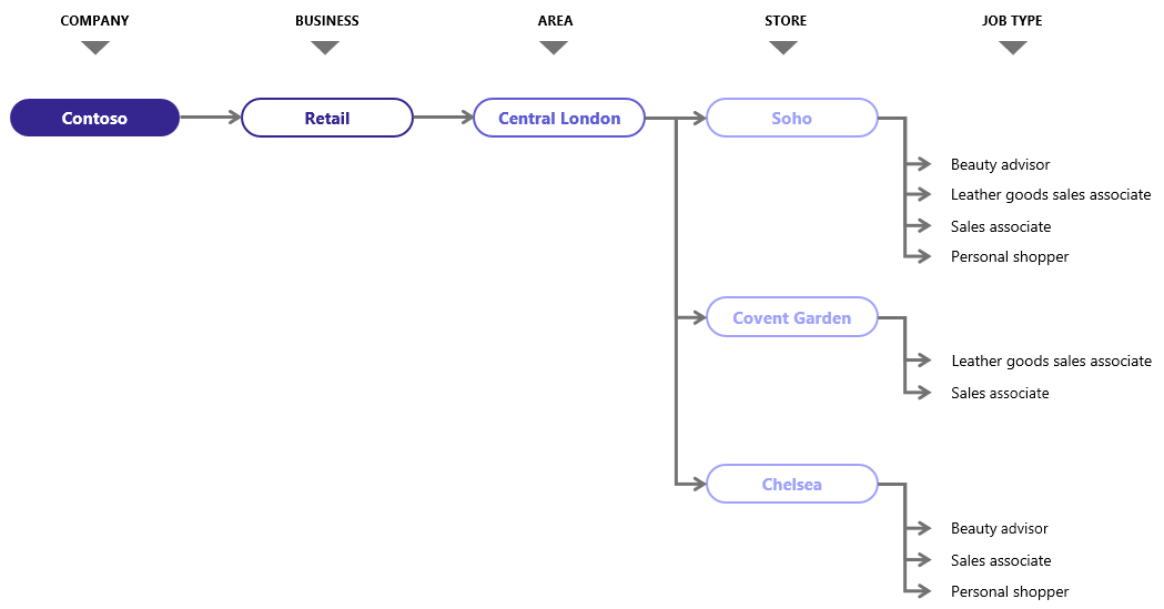 Contoso には、英国全体に何百もの小売店があります。 各店舗はイギリスのエリア内にあります。 この例を簡略化するために、Contoso が現場の従業員の Teams と Shifts のロールアウトを開始するセントラル ロンドン エリアの 3 つの店舗に焦点を当てています。