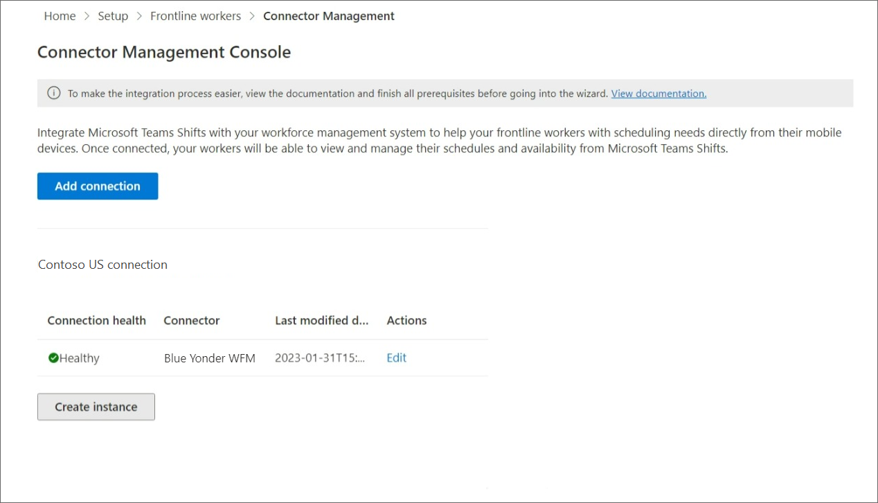 1 つ以上の接続インスタンスを作成し、それぞれ異なる同期設定を使用できます。 たとえば、組織に異なるスケジュール要件を持つ複数の場所がある場合は、場所ごとに一意の同期設定を持つ接続インスタンスを作成します。 Blue Yonder WFM インスタンスは、特定の時点で Teams のチームに 1 回だけマップする必要があります。 ただし、ウィザードでは、同じマッピングを持つ異なる接続インスタンスを使用できます。 つまり、重複するマッピングを使用して接続インスタンスを作成できます。
