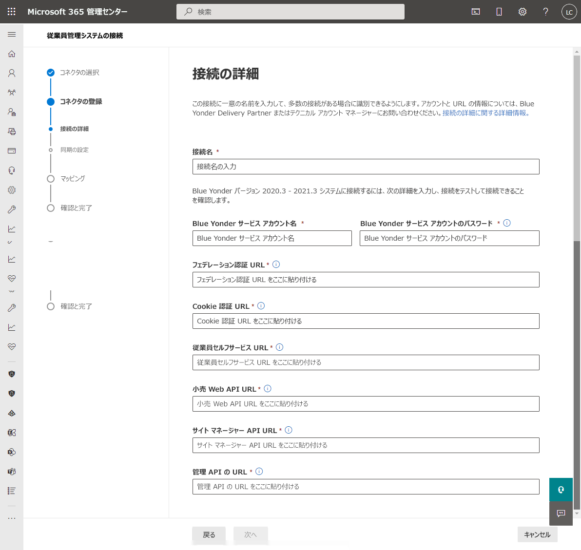 Blue Yonder WFM サービス アカウント名とパスワードとサービス URL: 接続の詳細がわからない場合は、Blue Yonder サポートにお問い合わせください。