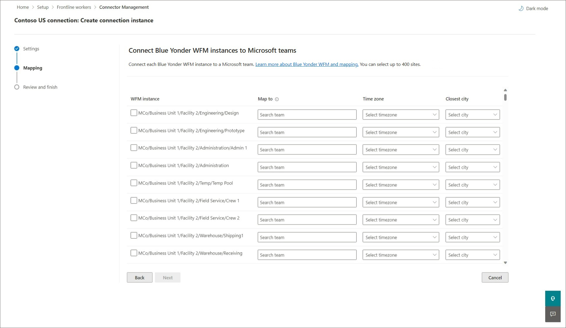 Shifts に接続する WFM インスタンスを選択し、各インスタンスを Teams のチームにマップします。 最大 400 個のインスタンスをマップできます。