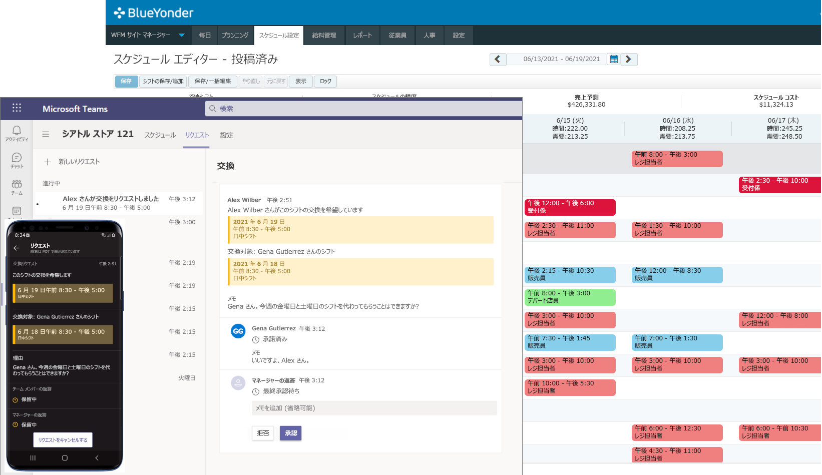 Alex は少し時間を取る必要があり、Shifts を使用して 1 日の休暇を要求します。 要求は、コネクタを介して Blue Yonder WFMに送信されます。 Blue Yonder WFM は、要求がビジネス ルールに準拠し、要求が作成されるようにします。 Blue Yonder WFM の要求が表示され、承認され、承認が Teams に同期されます。 (Eden は、Shifts で要求を表示および承認することもできます)。 Alex は Teams で要求が承認されたことを通知され、更新されたスケジュールが表示されます。