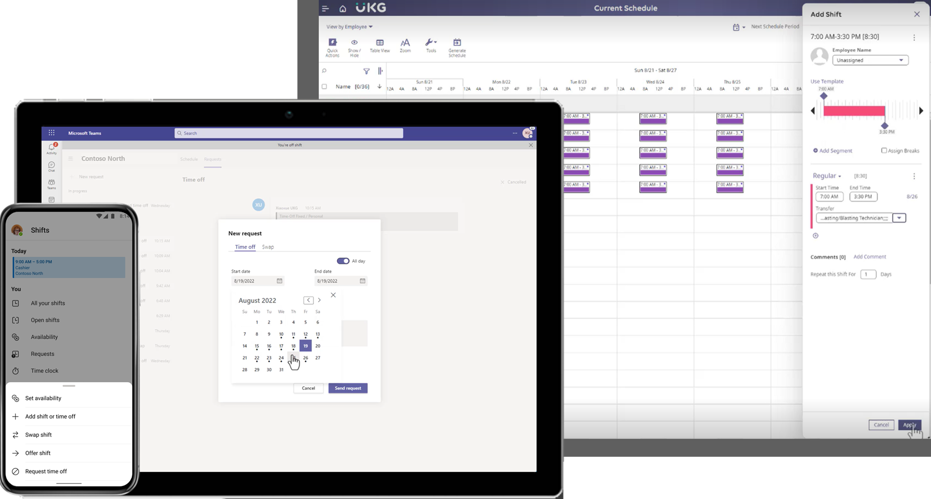 WFM システムを Teams に接続すると、現場の従業員はスケジュールをより効果的に管理し、より高いエンゲージメントと生産性を実現するために日常のプロセスを合理化できます。 現場担当者は、スケジュール設定、コミュニケーション、コラボレーションを行うための 1 つの場所を持ち、どこからでも、あらゆるデバイスで作業を完了する必要があります。