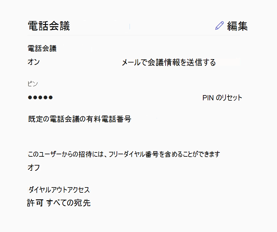 | ダイヤルアウトのアクセス許可 | この設定を変更するには、[電話会議] の横にある [編集] を選択し、[電話会議] ウィンドウの [会議からのダイヤルアウト] でオプションを選択します。 |