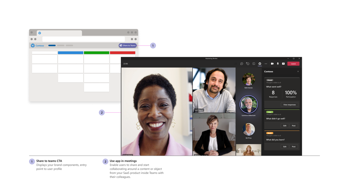 ブラウザー ベースの Web SaaS エクスペリエンス内の ディープ リンク を表示して、Teams アプリ内の特定のビューにユーザーを転送します (たとえば、個人用アプリ、タブ、会話ボット、共有会議ステージや会議内タブを使用した会議拡張機能など)。 ブラウザー ベースの Web SaaS エクスペリエンス内で、強くお勧めの Teams への共有 コントロールを実装して、ユーザーが Teams 内の SaaS 製品のコンテンツまたはオブジェクトを同僚と共有して共同作業を開始できるようにします。