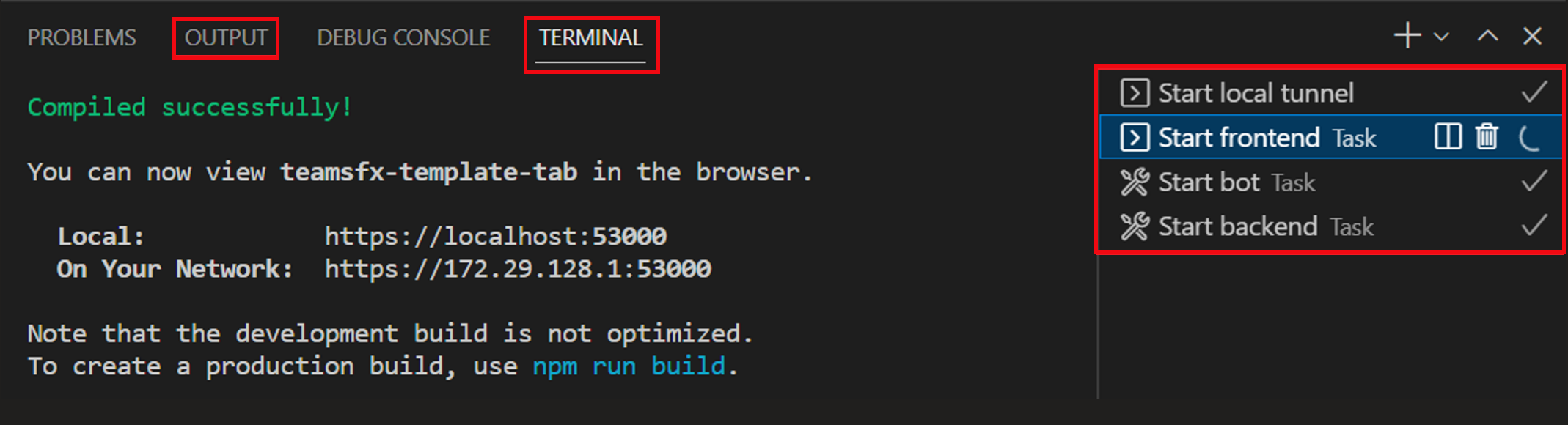 次の図は、タブ、ボットまたはメッセージ拡張機能、およびAzure Functionsの実行中に、Visual Studio Code の [出力] タブと [TERMINAL] タブにタスク名を表示しています。