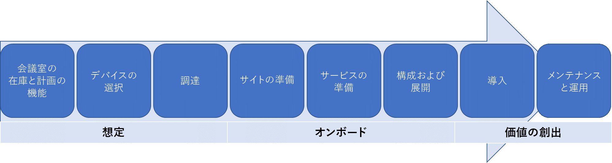 まず、どのような会議室があるかを把握し、将来的にどのような会議室が最適かを想定してから、必要な機器の選択と調達、サイトの準備、サービスの設定と展開、変更とユーザー導入の管理、運用とメンテナンス手順の開発に進みます。