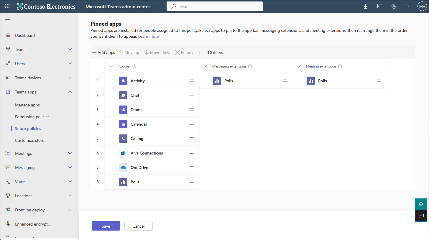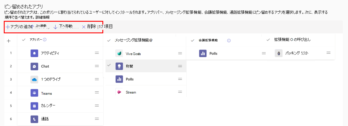 アプリを Teams クライアントに表示する順序で配置します。 シーケンスは、 アプリ バー、 メッセージング拡張機能、 会議拡張機能、 および通話拡張機能で個別に変更できます。 スコープからアプリを削除できます。