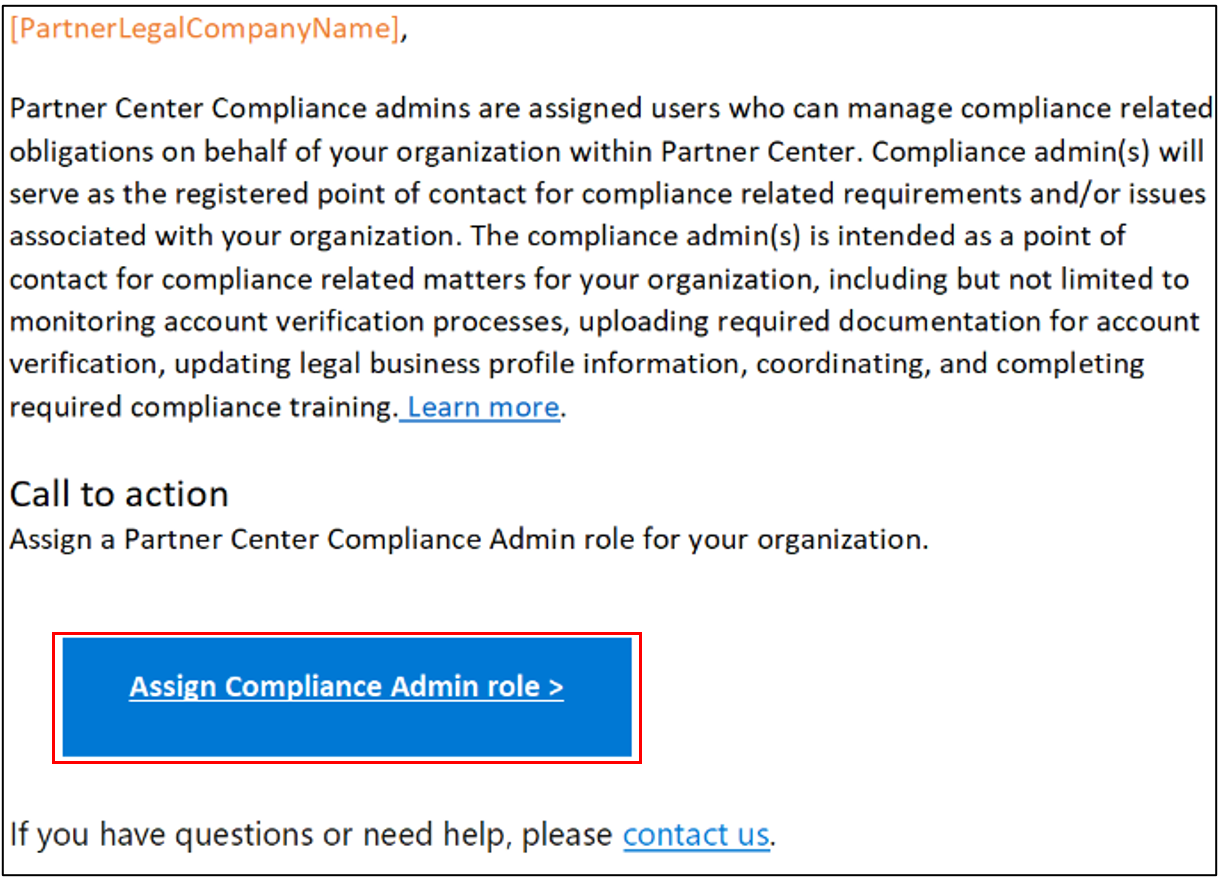 パートナーは、パートナーに代わってコンプライアンス関連の問題に取り組むことをパートナーが承認したパートナー従業員にコンプライアンス管理者ロールを割り当てることをお勧めします。 専用のコンプライアンス管理者がいない場合は、グローバル管理者ロールを持つユーザーにこのロールを割り当てることをお勧めします。