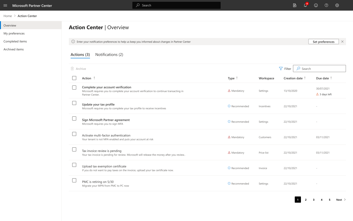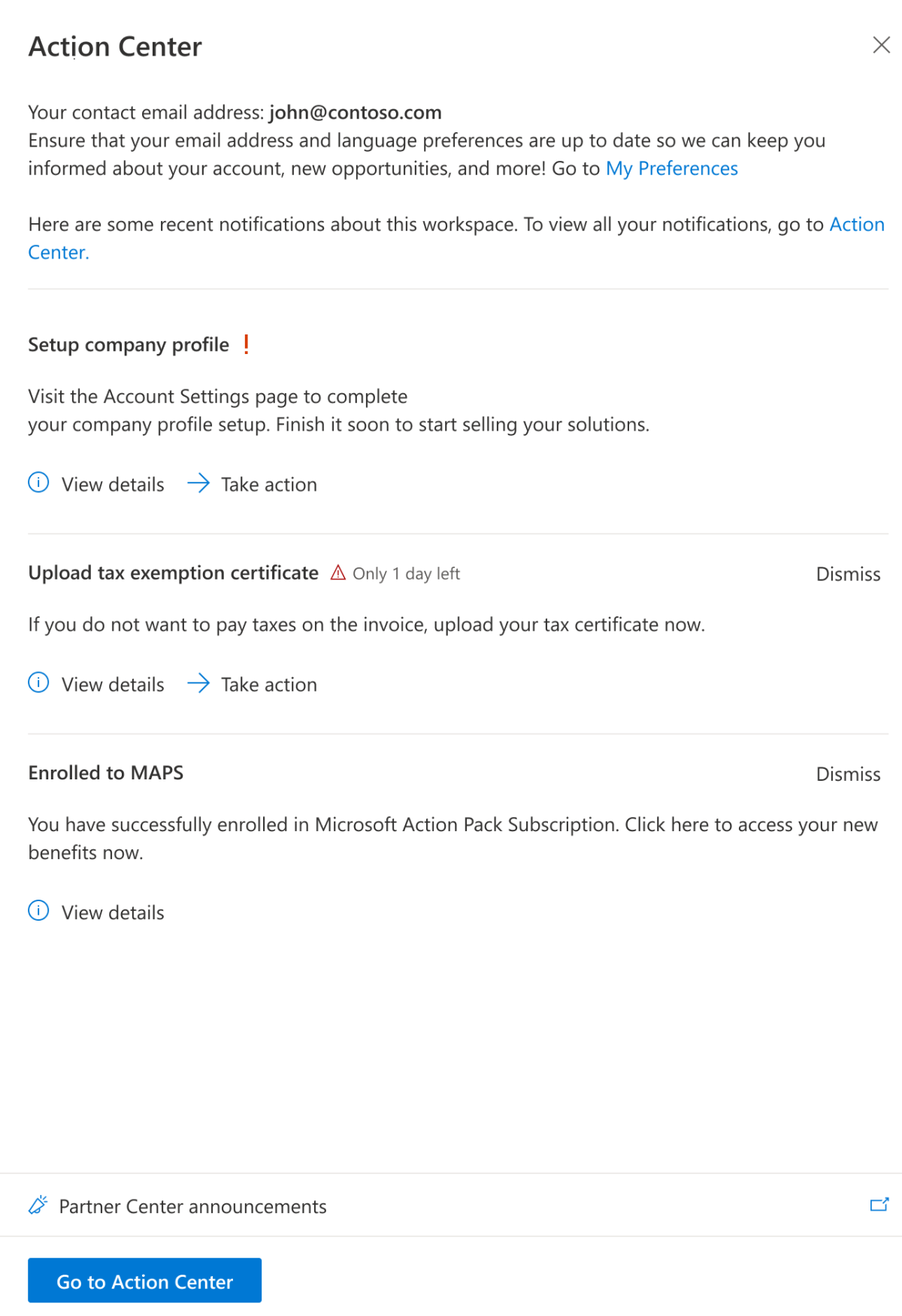 - アクション センターでは、パートナー センター アカウントのすべての アクション と 通知 を表示または管理できます。