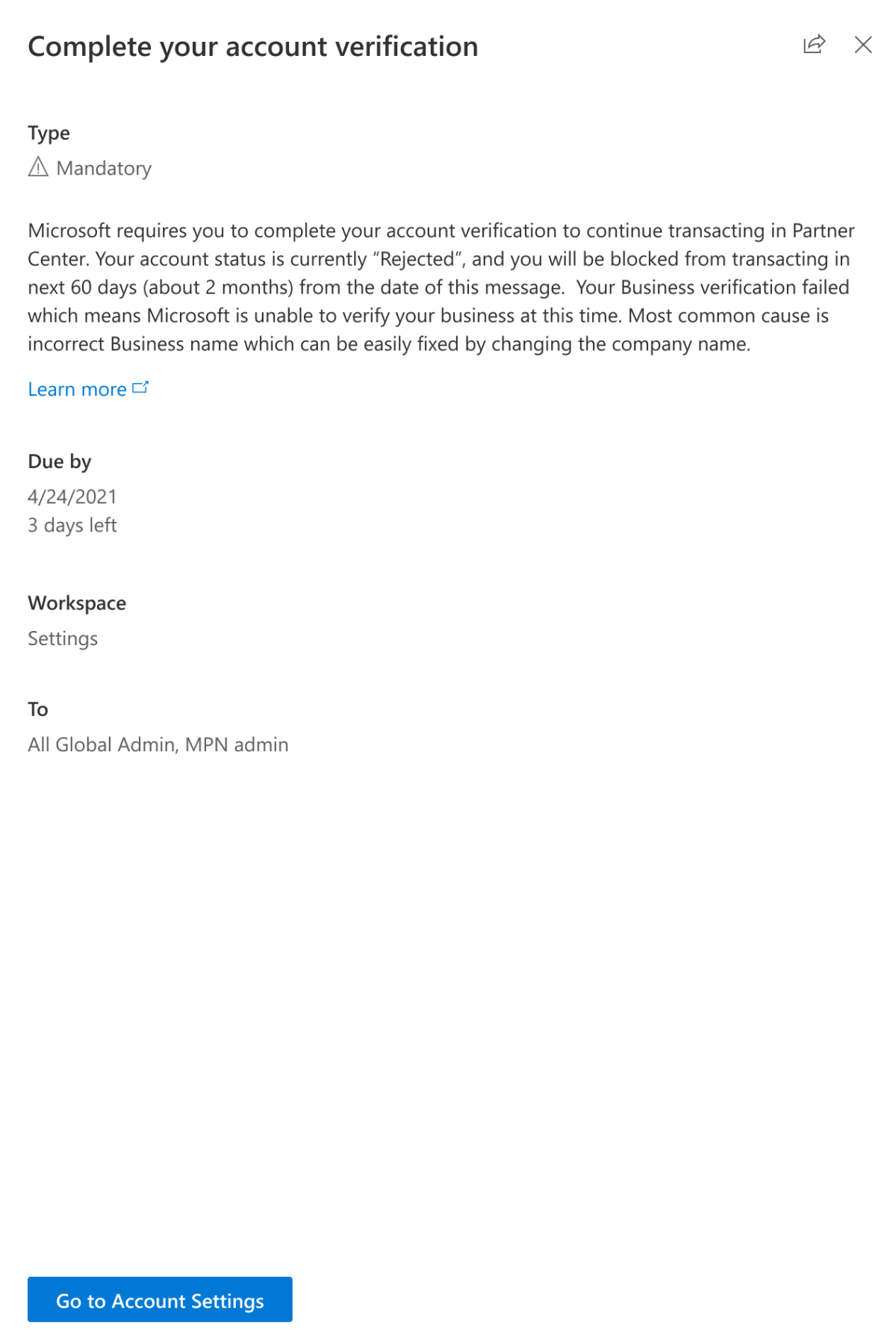 必須アクション とは、アカウントの確認を完了するなど、期限までに完了する必要があるタスクです。 期限までに必須のアクションを完了しないと、パートナー センターで Microsoft と取引する能力が損なわれる可能性があります。 必須アクションをアーカイブすることはできません。