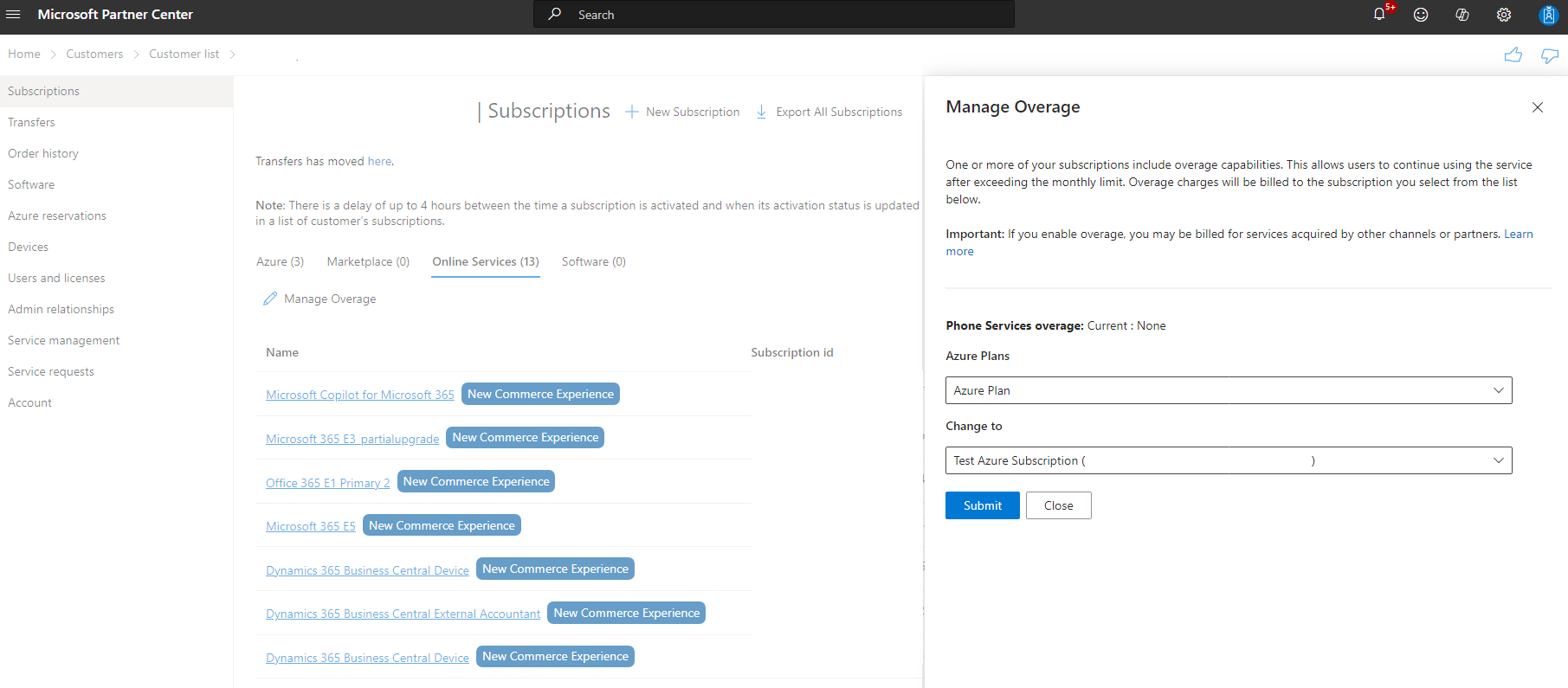 - 顧客が現在 Azure レガシ オファーを使用している場合は、超過分を有効にする前に Azure プランに移行する必要があります。 現在の Azure プランから Azure プランに顧客を移動する方法について説明します。