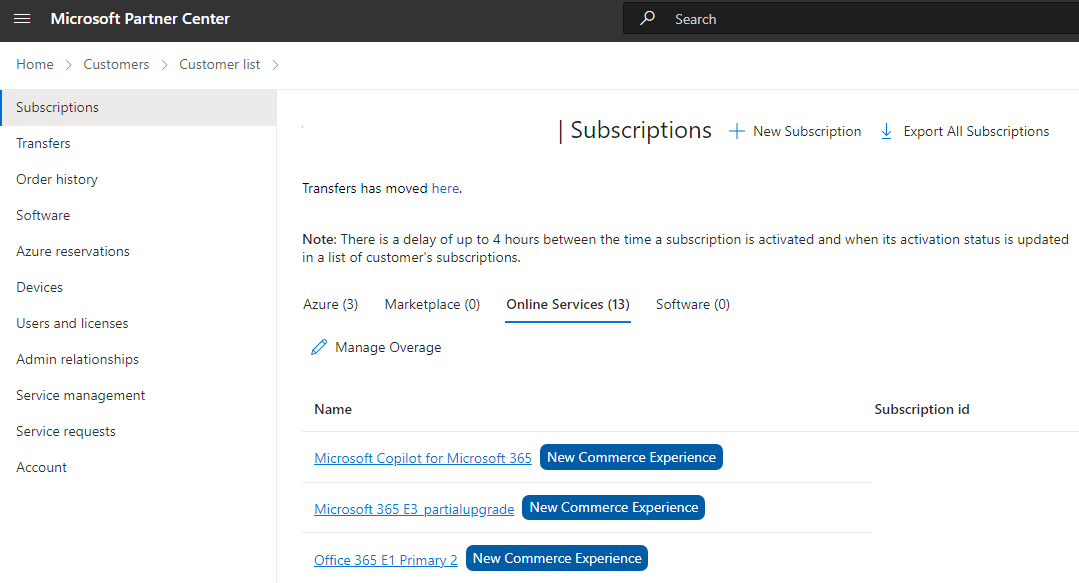 - パートナーは常に、[超過分の管理] で超過分を表示したり、他のサブスクリプションに再割り当てしたりできます。