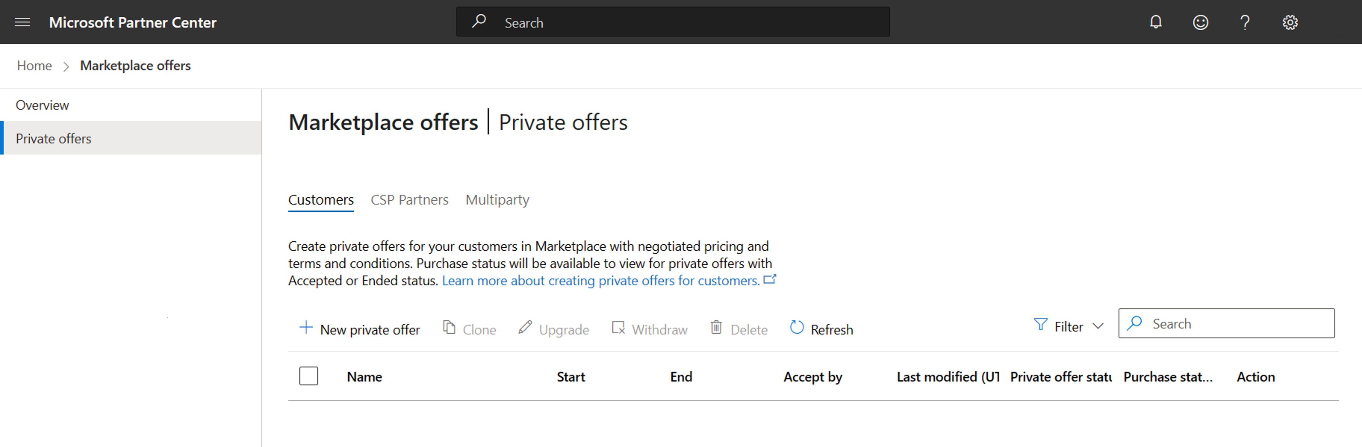 - マルチパーティ: チャネル パートナーを含み、Microsoft Marketplace を通じて取引されるプライベート オファーを作成します。 マルチパーティプライベートオファーを参照してください。