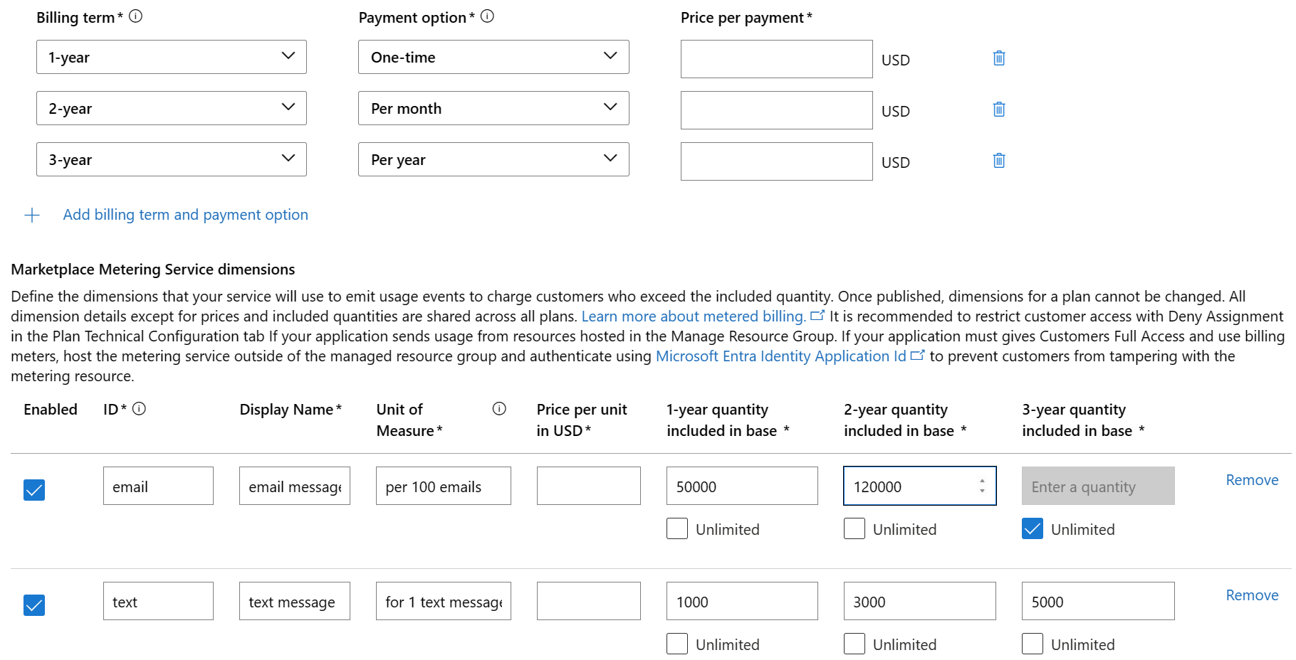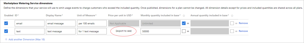 - 定額プランには、定期的な料金に加えて、定額に含まれていない超過分の使用量を顧客に請求するために使用されるオプションのカスタム ディメンションを含めることもできます。 各ディメンションは、Marketplace 測定サービス APIを使用してサービスが Microsoft と通信する課金対象ユニットを表します。