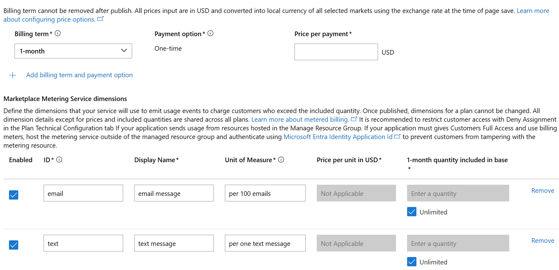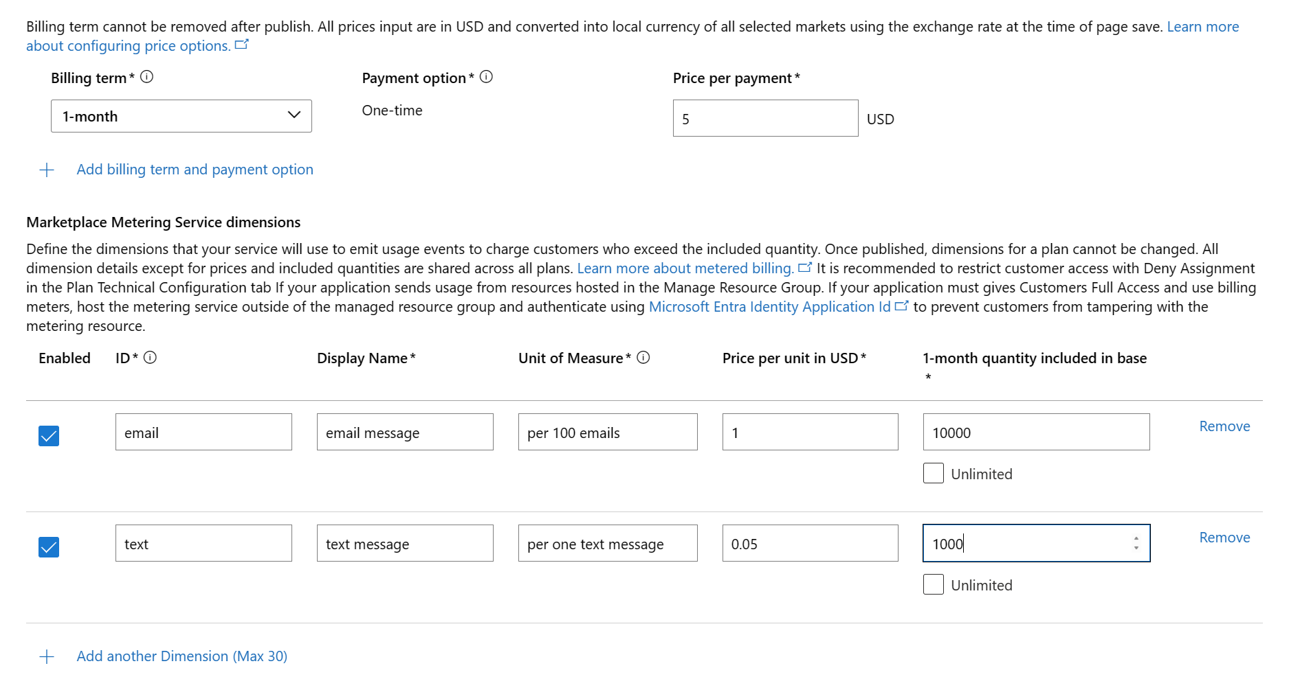 Marketplace 測定サービスで使用されるディメンションは、顧客がサービスの支払いを行う方法を理解していることを表しているため、ディメンションを公開した後、ディメンションのすべての詳細を編集できなくなります。 発行する前に、プランのディメンションを完全に定義することが重要です。